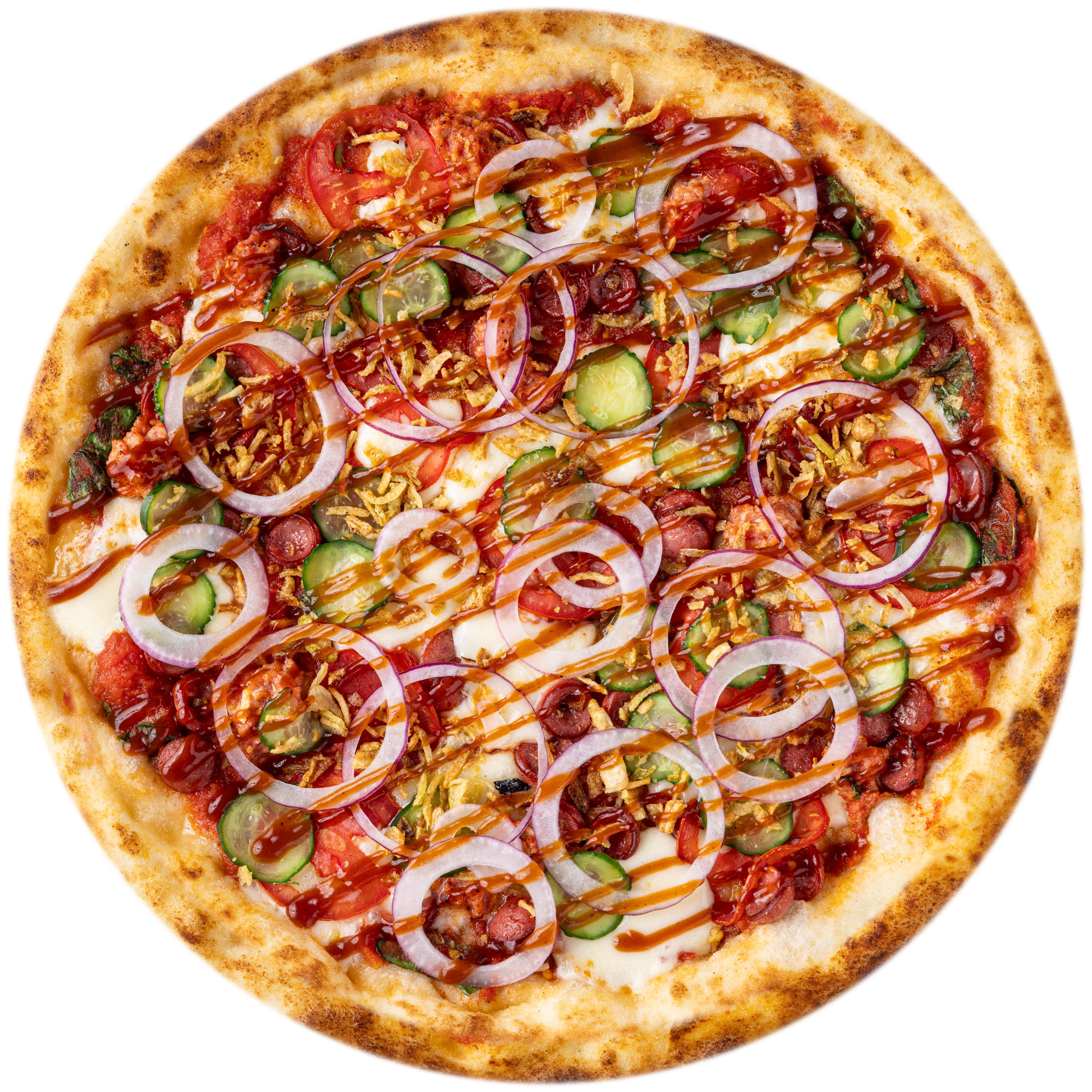 Пицца «Мюнхенская» —это сытное сочетание мясного топпинга(мусс из салями,ветчины ,бекона и копченых колбасок), лука фри и расплавленной моцареллы на мягкой корочке. Соус придаёт пикантность, создавая насыщенный вкус, идеально подходящий для любителей мясных блюд.