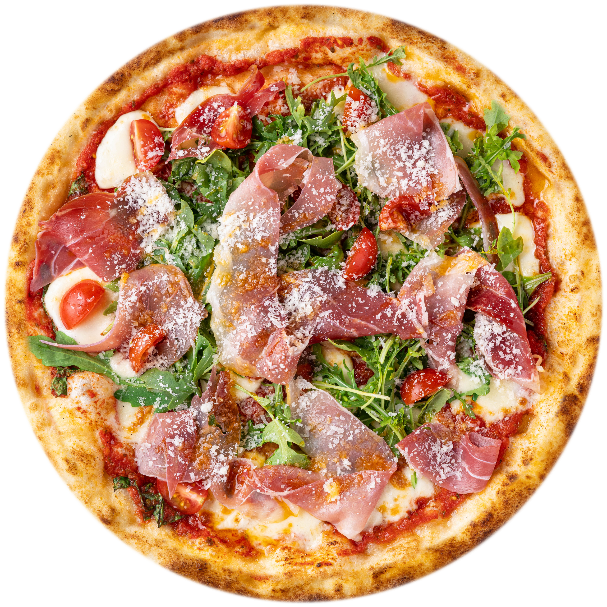 Пицца «Прошутто с рукколой и томатами» — это изысканное сочетание тонких ломтиков прошутто, свежей рукколы и сочных томатов на хрустящей основе. Оливковое масло и лёгкий, сливочный сыр страчателла завершают вкус, добавляя блюду аромат и утонченность.